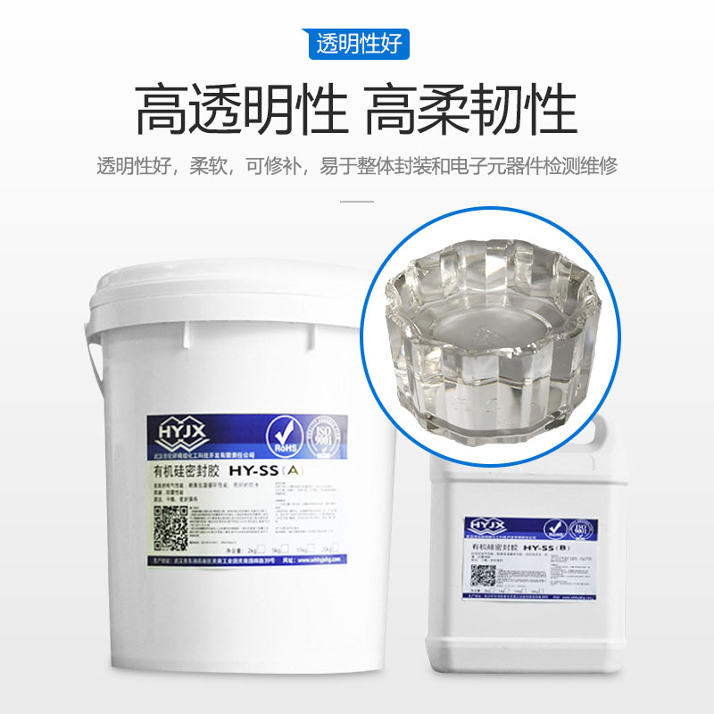 無色透明、雙組份加成型灌封膠,分為A、B組份,A:B=1:1。無色,無味,難燃,邵A硬度20--30。